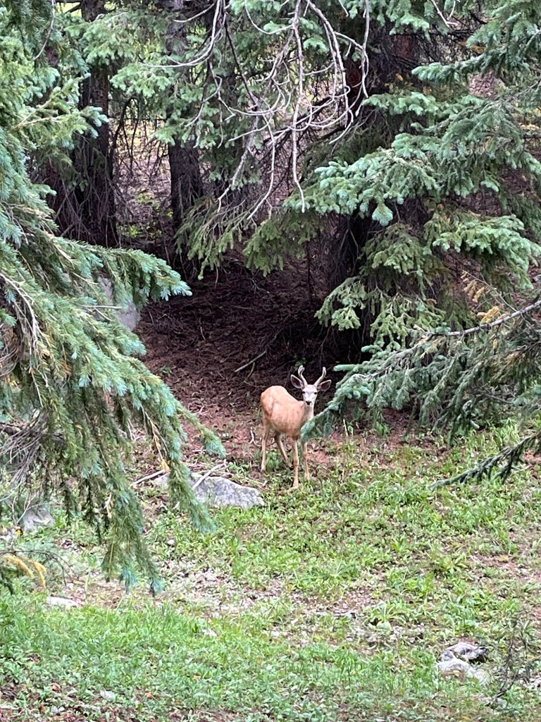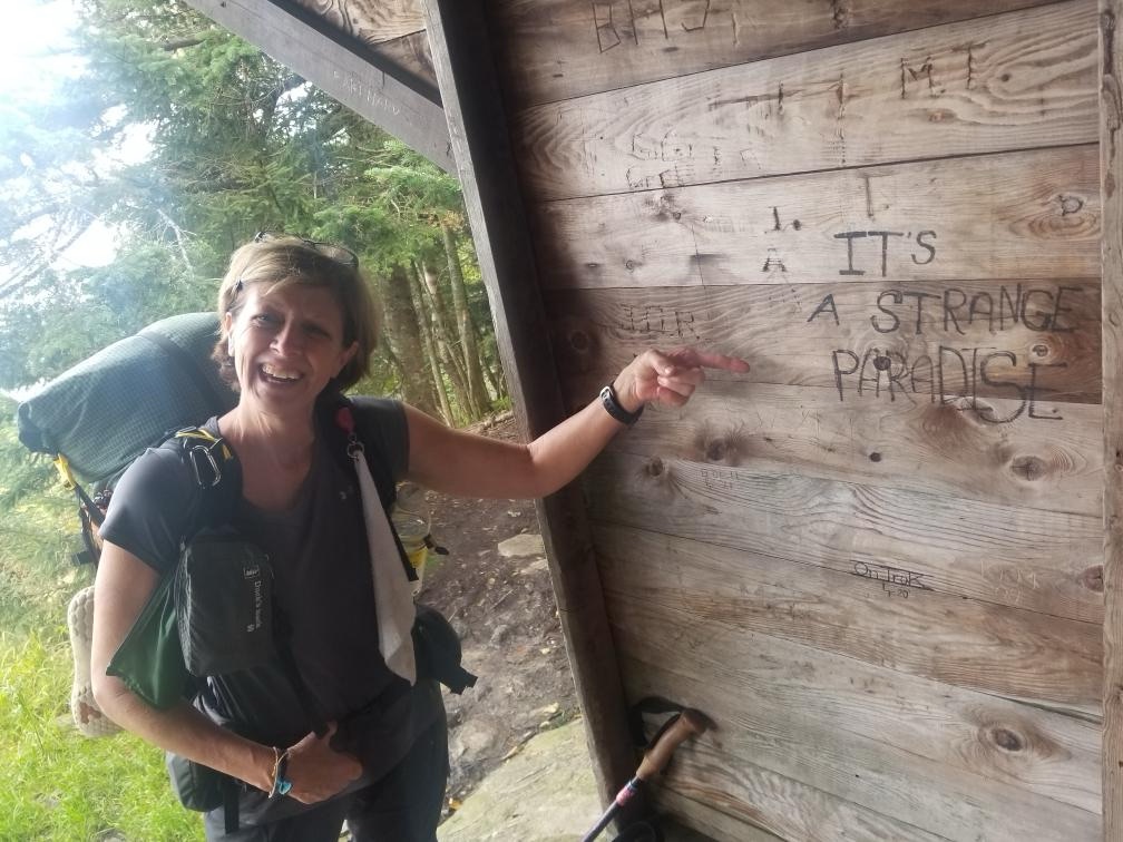 Whaaat?? We actually got a view today. It was actually a peek at a view. Another day of straight ups and straight downs. Still pretty much in the green tunnel. Hiking this trail has been like bushwacking today. The spruce limbs have covered the trail in many places and you have to push them aside to get through or just let them hit you in the face. One positive is that we have a little hint of a spruce smell now which is an enormous improvement as far as our funk goes. Day 7 with no bath—just imagine. We’ve sweated every day. We’ve used deet almost every day. We’ve tromped through mud almost all day everyday. We’ve worn the same clothes and even socks everyday. It’s gonna take quite a scrub or two to get clean.