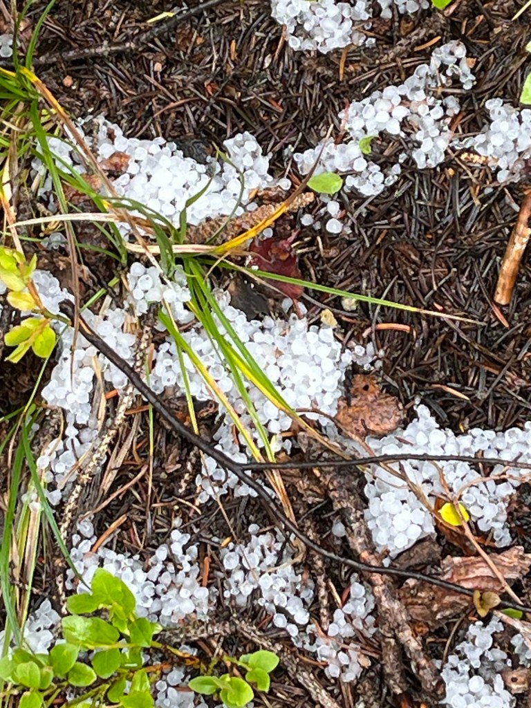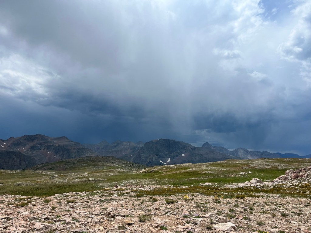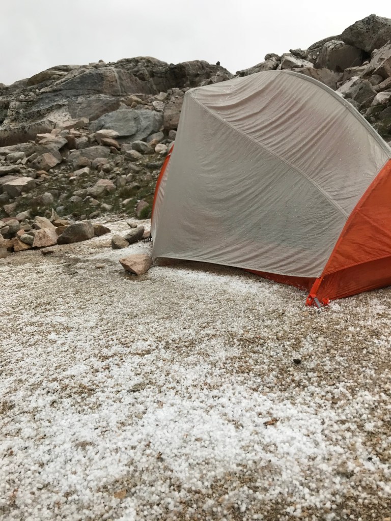 The weather on the CT is crazy. You’re at such a high elevation most of the time so it’s very unpredictable. The trail starts at a little over 5,000 feet and ascends to over 13,000 ft. You’re above treeline much of the time. You might be hiking during the day in sunny, 90 degree weather and wake up with frost on your tent in the morning. You could be hiking with no sign of clouds and within 10 mins the skies turn dark and you get pelted with “grapple” (pea-sized hail). Lightening is the worst. You might be the tallest thing on the mountain when you’re above treeline so it’s not very smart to head up the mountain if you know a storm is coming. Because it’s so unpredictable, you try to position yourself where you can get up and over the high point and back down below treeline by noon. Doesn’t always work out though. There are a few days that you’re literally above treeline all day and night.