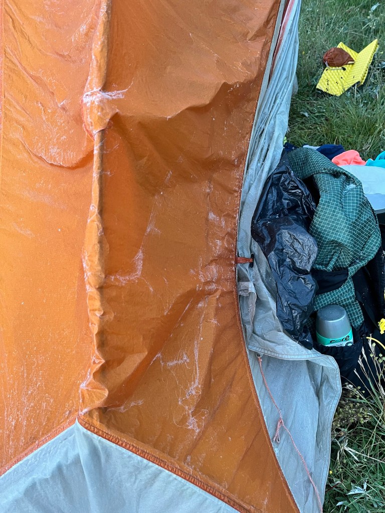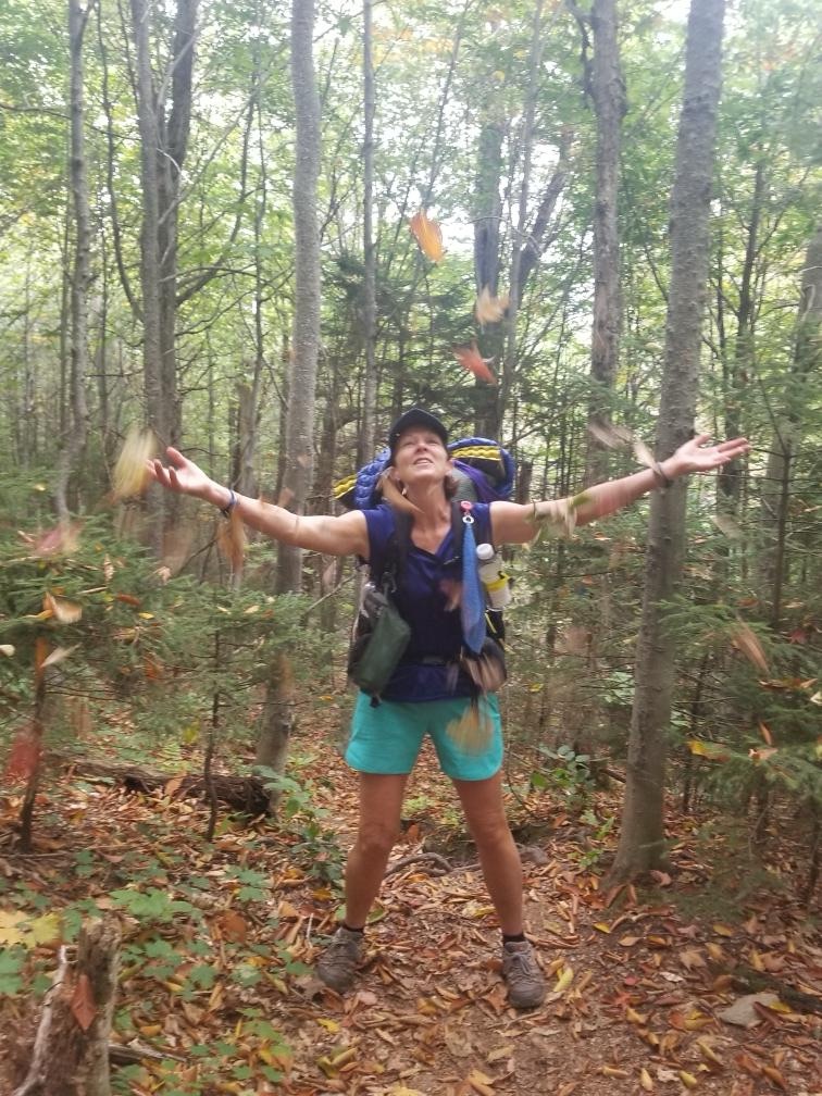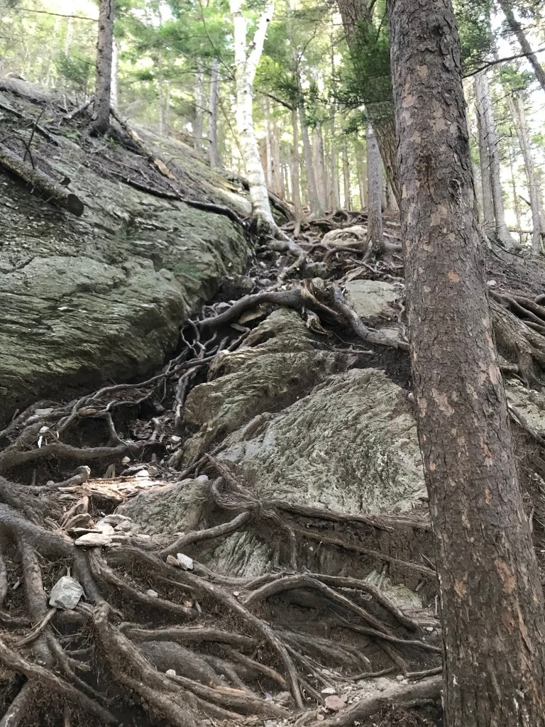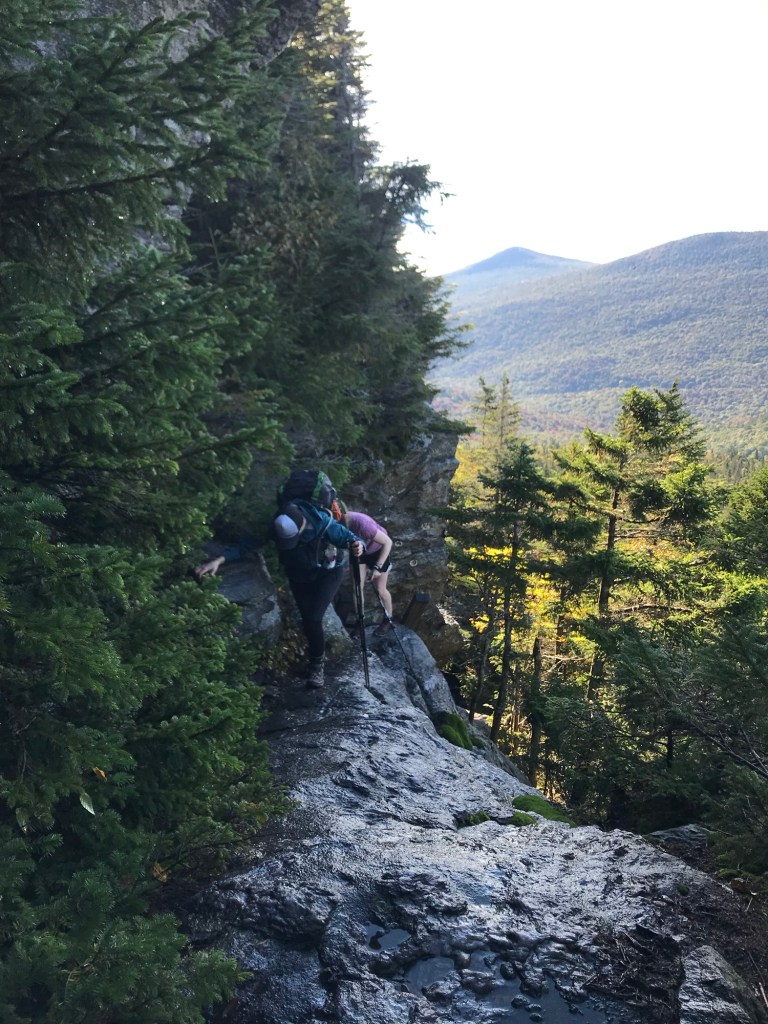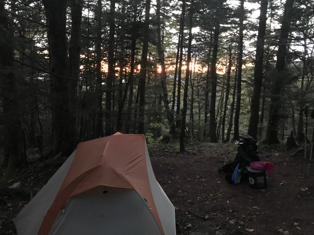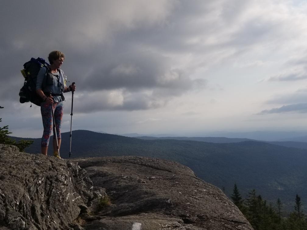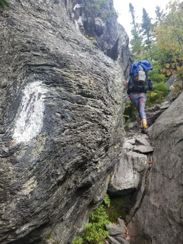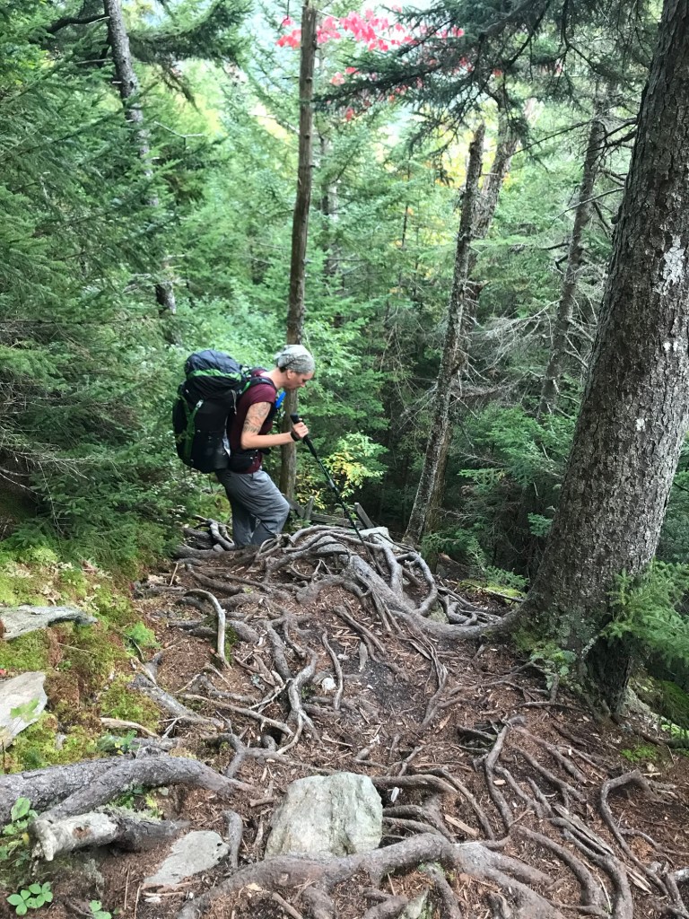 So we’ve been trying to outrun a thunderstorm all day. I fell again today. Again, I’m fine–it just made me mad. We managed to find a spot to stealth camp. We’re just off in the woods, kind of in a low spot so we put a few logs at the bottom of the hill in front of our tents and we dug a little trench in front of the logs hoping to keep some of the water out. We quickly cooked, ate, hung bags and ducked in just as the rain started. It started as a gentle rain with a little wind and soon turned into a full fledged storm with wind, rain, thunder and lightning. My tent is covered with leaves that have blown up and stuck to it. Will be a fun morning tomorrow cleaning it up. Happily, we have quite a climb (hoping for a view) and then after about 11.5 miles, we’ll hitchhike into Waitsfield where we’ll pick up another resupply. We’ll also spend the night there and get to shower—yay!!!! I’m so excited to get a hot meal, a shower, and a bed. We’re exhausted.