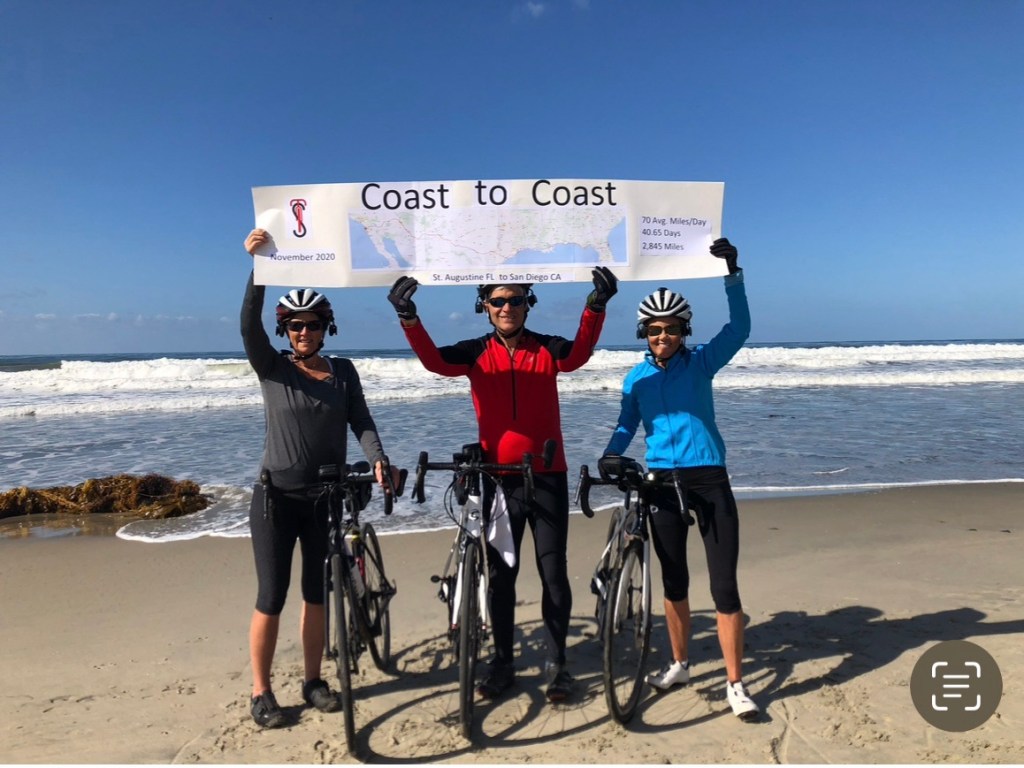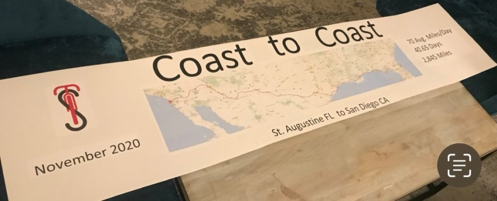 We completed the ride in 2020. We rode through 8 states: Florida, Alabama, Mississippi, Louisiana, Texas, New Mexico, Arizona and California. The trek was 2,845 miles. We averaged 70 miles/day. We had 40.65 riding days.