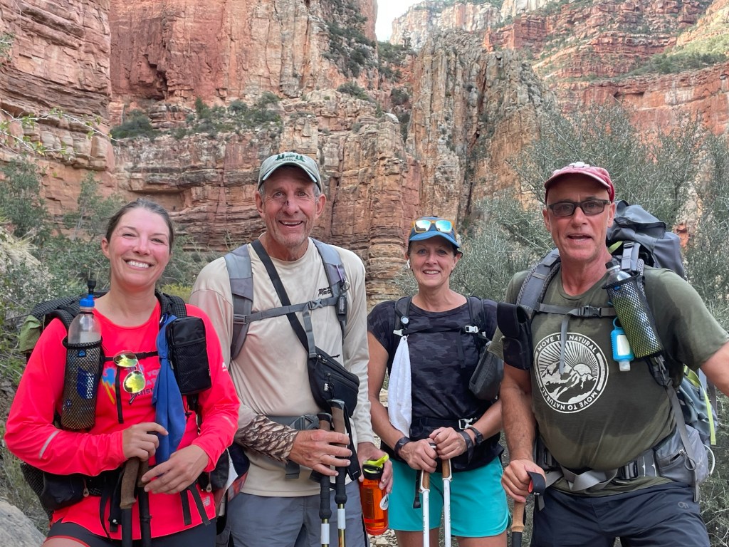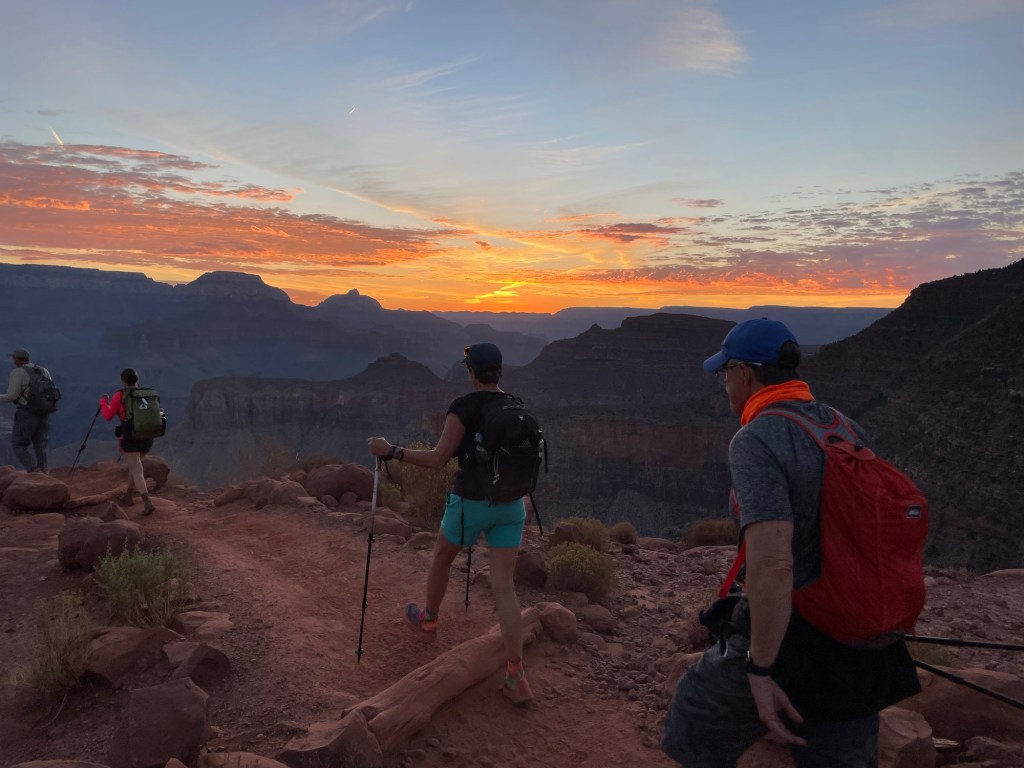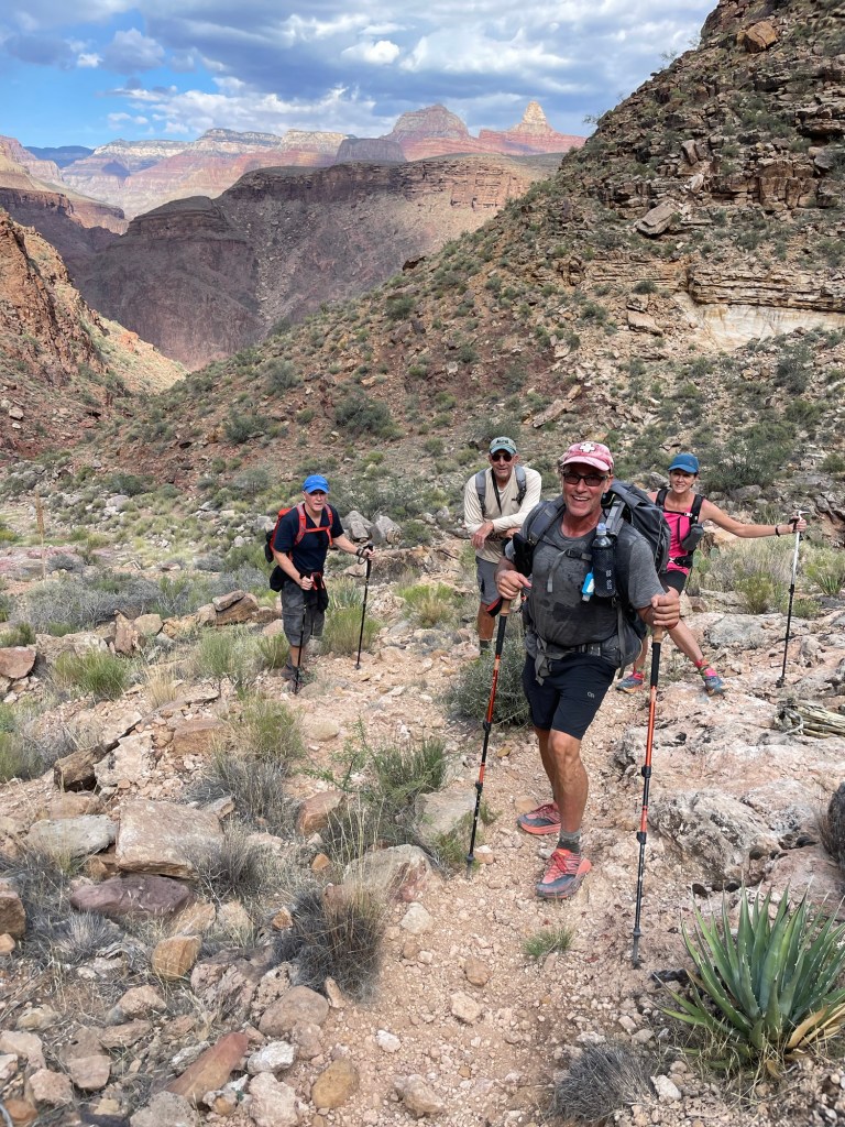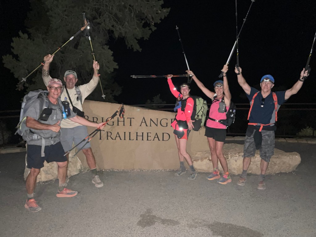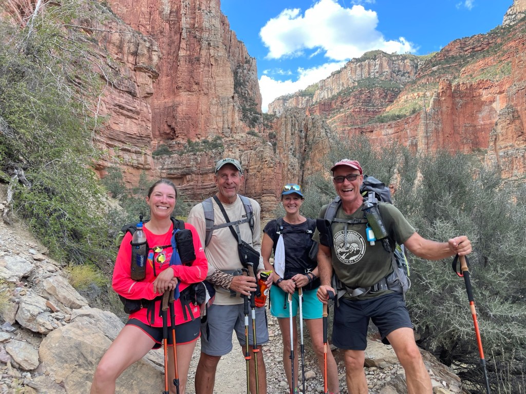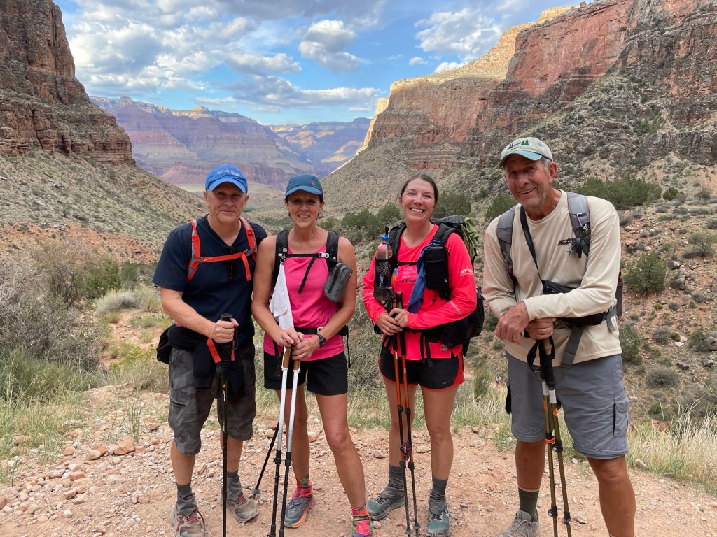 Danny and I were invited to join our friends Ron and Mitch from TX who have been hiking the Grand Canyon for many years. We had joined them the year before to hike down to Phantom Ranch (a lodge at the bottom of the canyon), spend the night and hike on to the north rim the next day. It was an amazing hike so we decided to do it again. But….this time we would basically double the miles in one day and then turn around and do it again the next day, hence Rim-to-Rim-to-Rim.