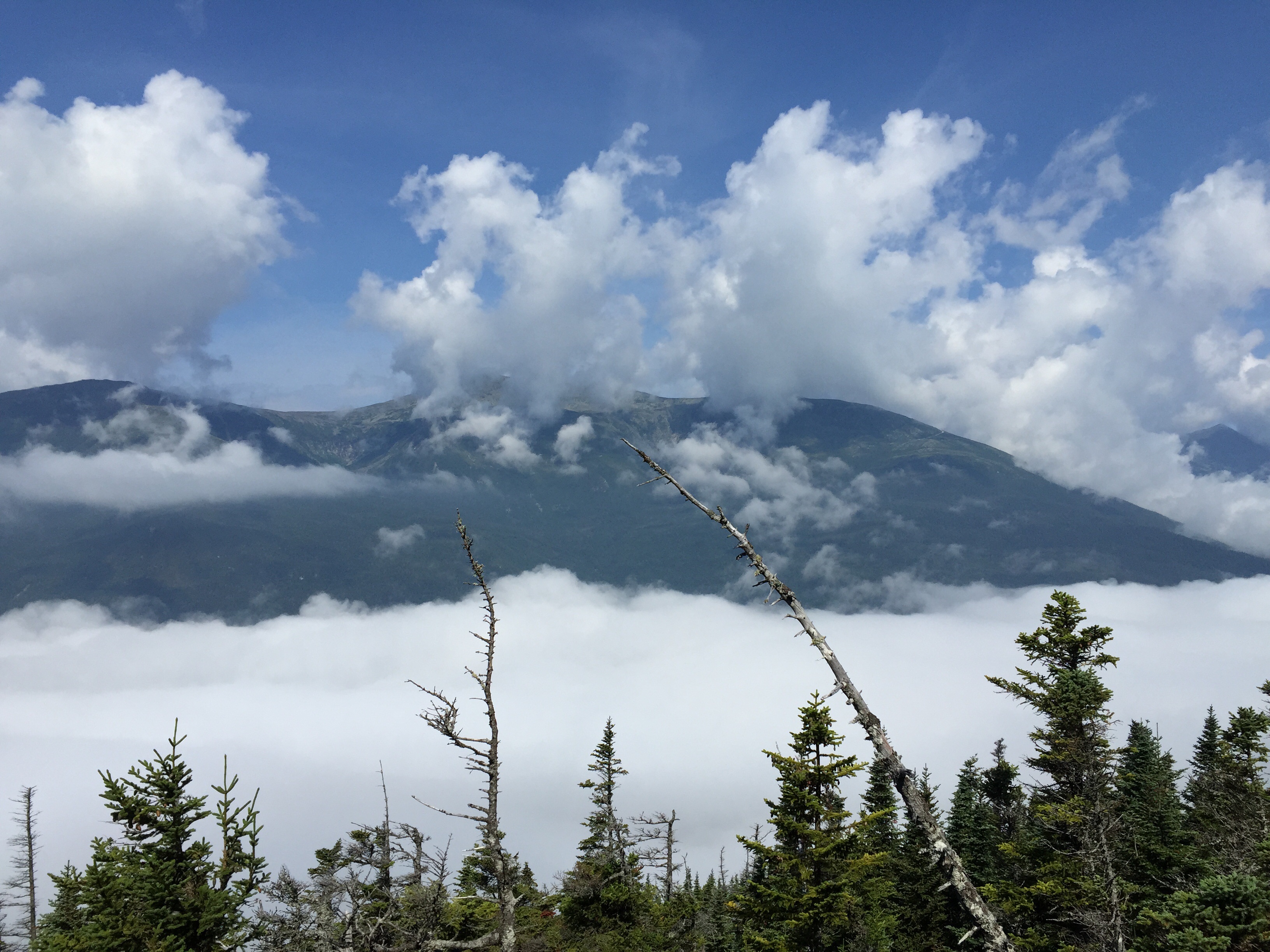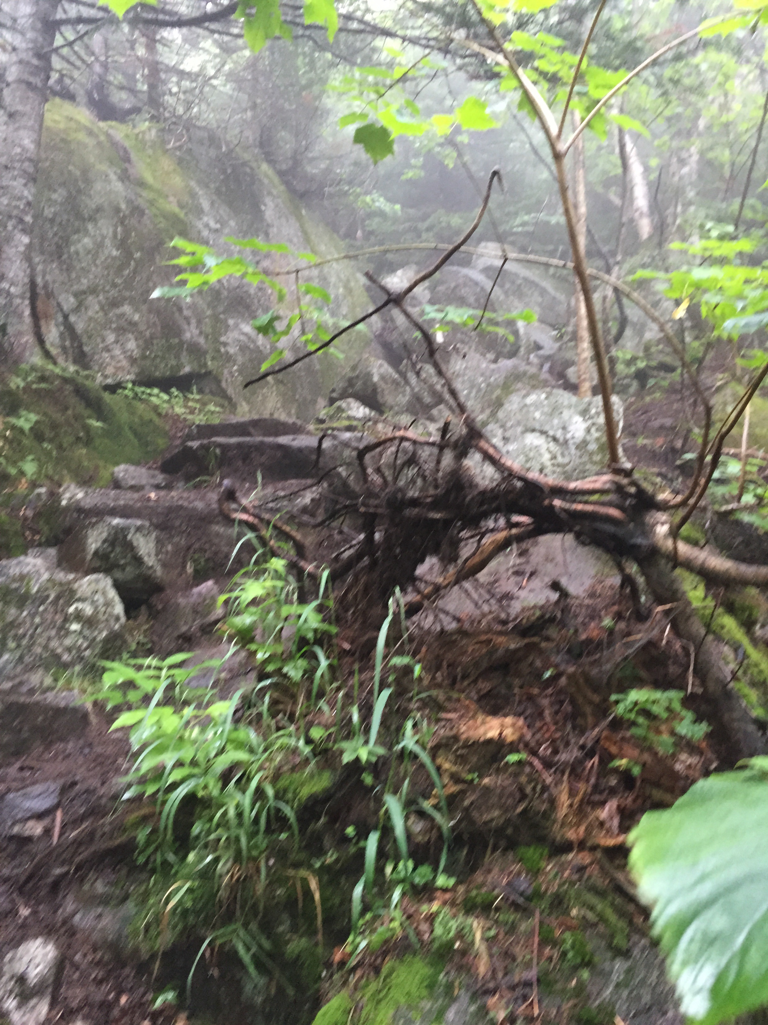Today started with a really fun all-fours climb for a couple of hours. Then, it was constant ups and downs and the downs were really steep (as is always in the Whites). I’m sure I’ve said it before, but I’m really started to hate the downs. They are really treacherous and it seems it’s always wet. Today we made it to the last hut about lunchtime so we stopped in to eat lunch and fill up on water. While we were stopped, the thunder clapped a few times and the sky starting spitting rain. We waited a few minutes, but we had no choice but to keep moving. We had yet another straight up climb and the water was running down it like a river. The rain only lasted about 30 minutes, but the trail and all the trees and we the people were all soaked. Tis life on the AT. So much for nice, new shoes. They got baptized today.