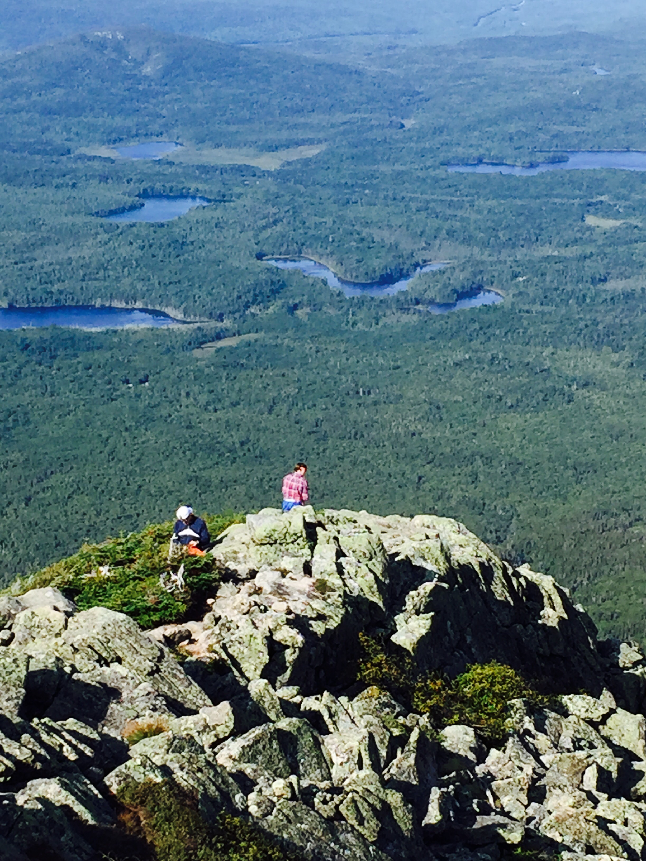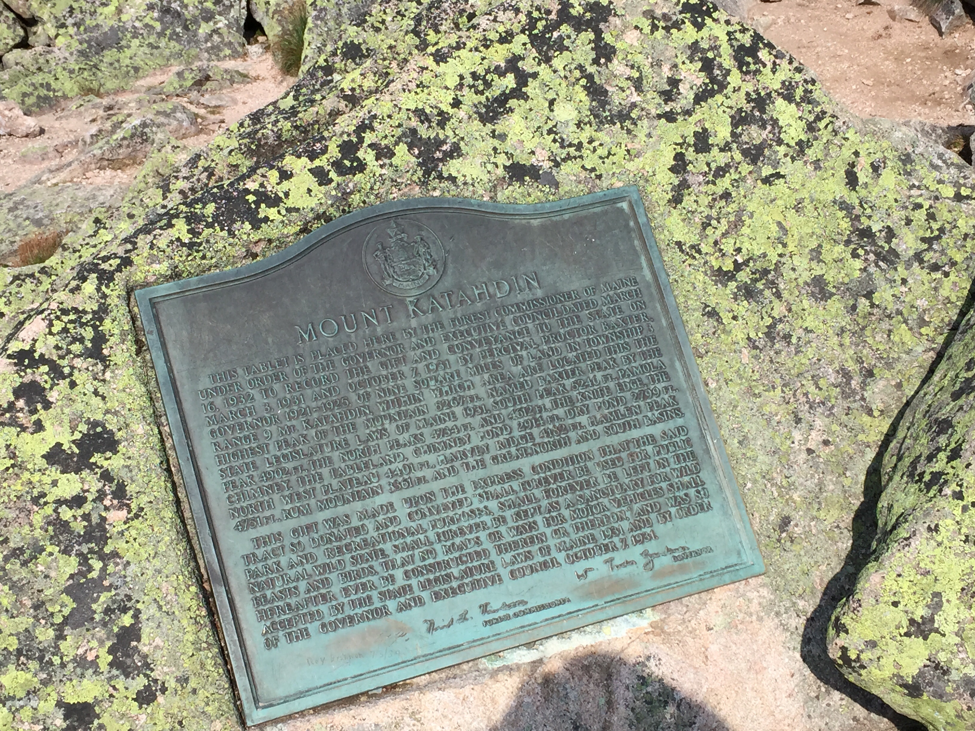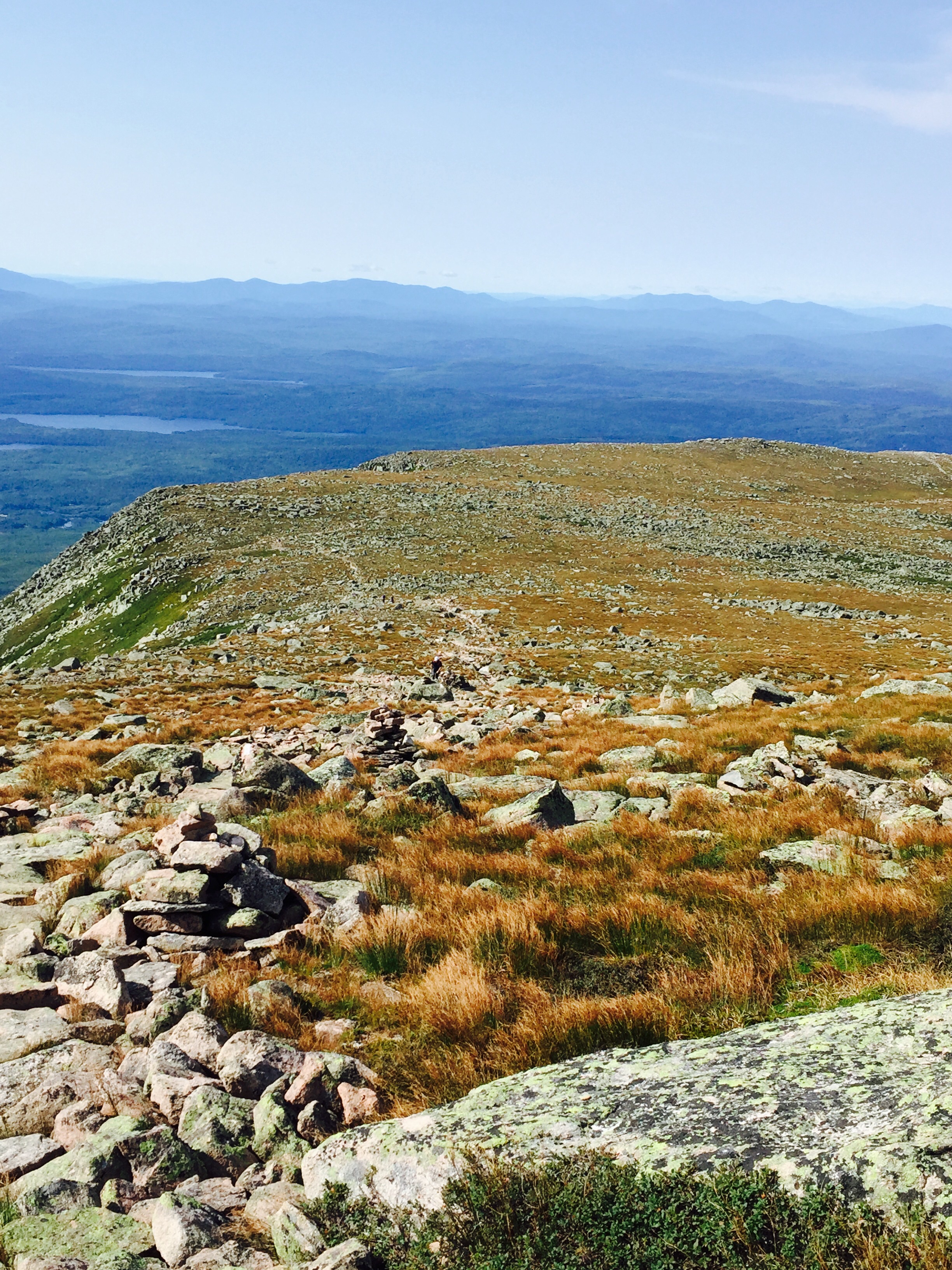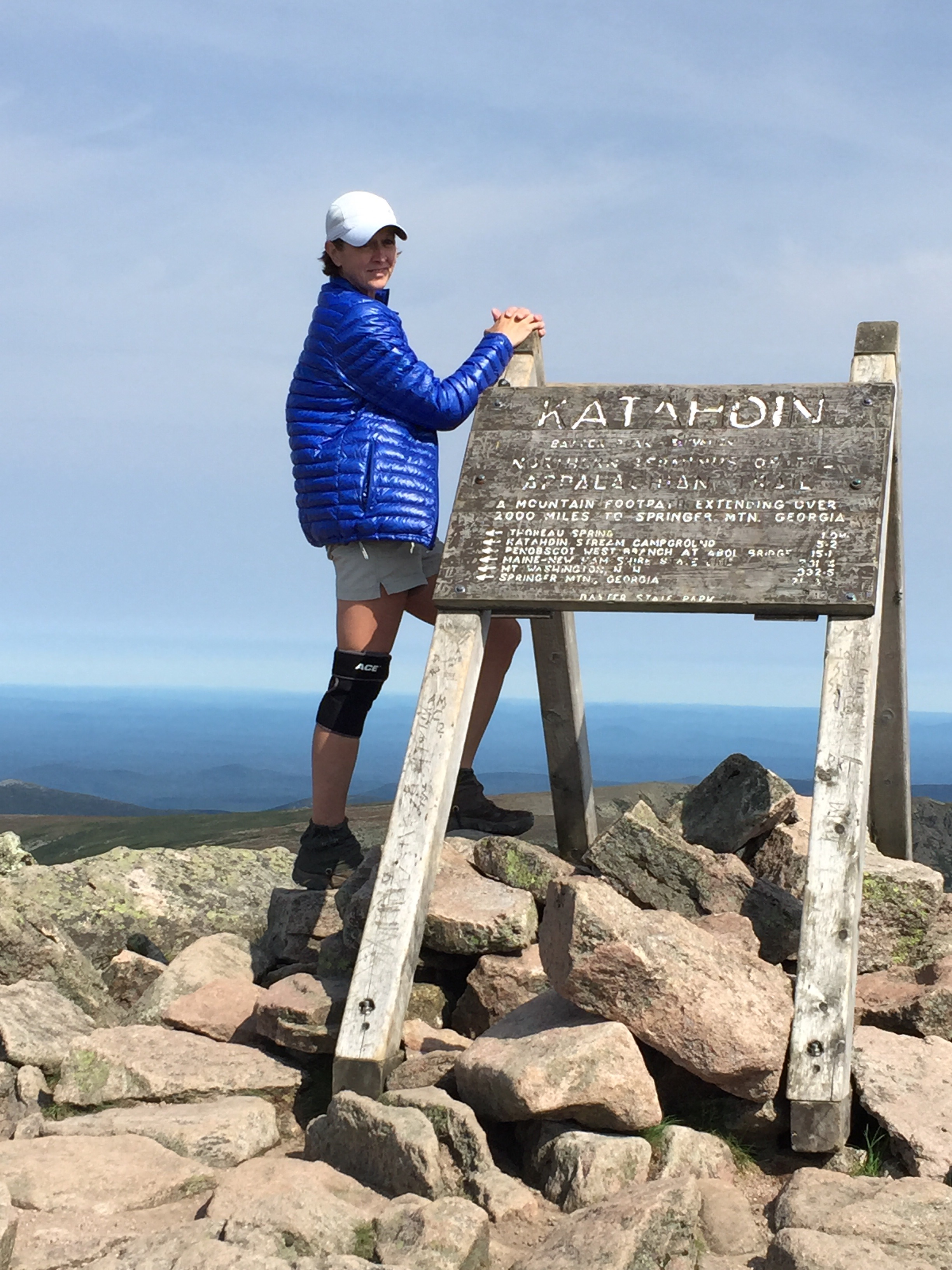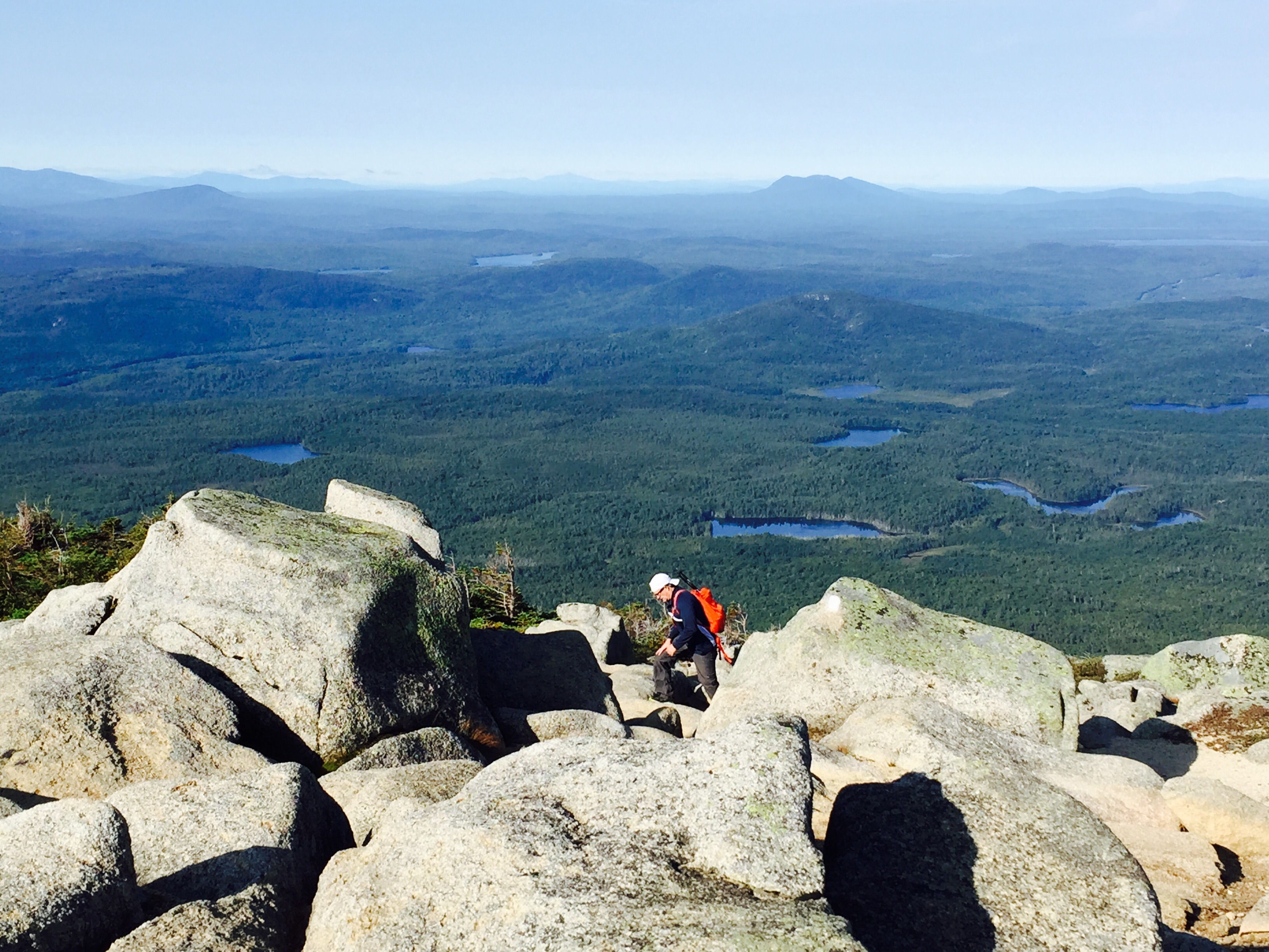 We were up at 4 am and out the door by 4:45 am. We drove to the gate and were 4th in line at 5:30 am. The gate opened at 6 am and we drove to the Katahdin Stream Campground parking area and were hiking up by 6:30 am. The trail ran along the stream for a little ways and then meandered up to a few boulders. Over those and then it was time to put away the trekking poles and do some “all-fours” climbing. You had to scout out the white blazes, but you basically just had to find the hardest way up and there they’d be. What fun, though. It was boulder and slab scrambling for quite a ways. There were a few rebar holds here and there for a little support. When we thought we were close to the summit (because visually it didn’t look like we could go any higher), we had reached what’s called the Tableland which is a pretty flat walk across the backside of what looked like the summit. We walked for about 1.2 miles across and then climbed another .4 to the summit. I had to touch the wooden sign when I arrived. Like someone on top said, “It never felt so good to touch a piece of wood”, and I agreed. Happy Day!!! I’ve waited six years to get to the top of Katahdin. What a beautiful mountain. I really did feel like I was on top of the world. Looking down was spectacular. The tree tops were tiny. Maine has ponds and rivers all over the place, so you could see water for miles and miles. The people coming up were tiny. The people on top were glowing with joy and relief. Everyone congratulated one another. We spent an hour on the summit talking to other hikers and enjoying the views (and, of course, a snack too). I actually got a little emotional after we had taken pictures and had sat down. As I’ve said before, I have no idea why this is so important to me and I have no idea why it would be emotional for me, but it is and it was.