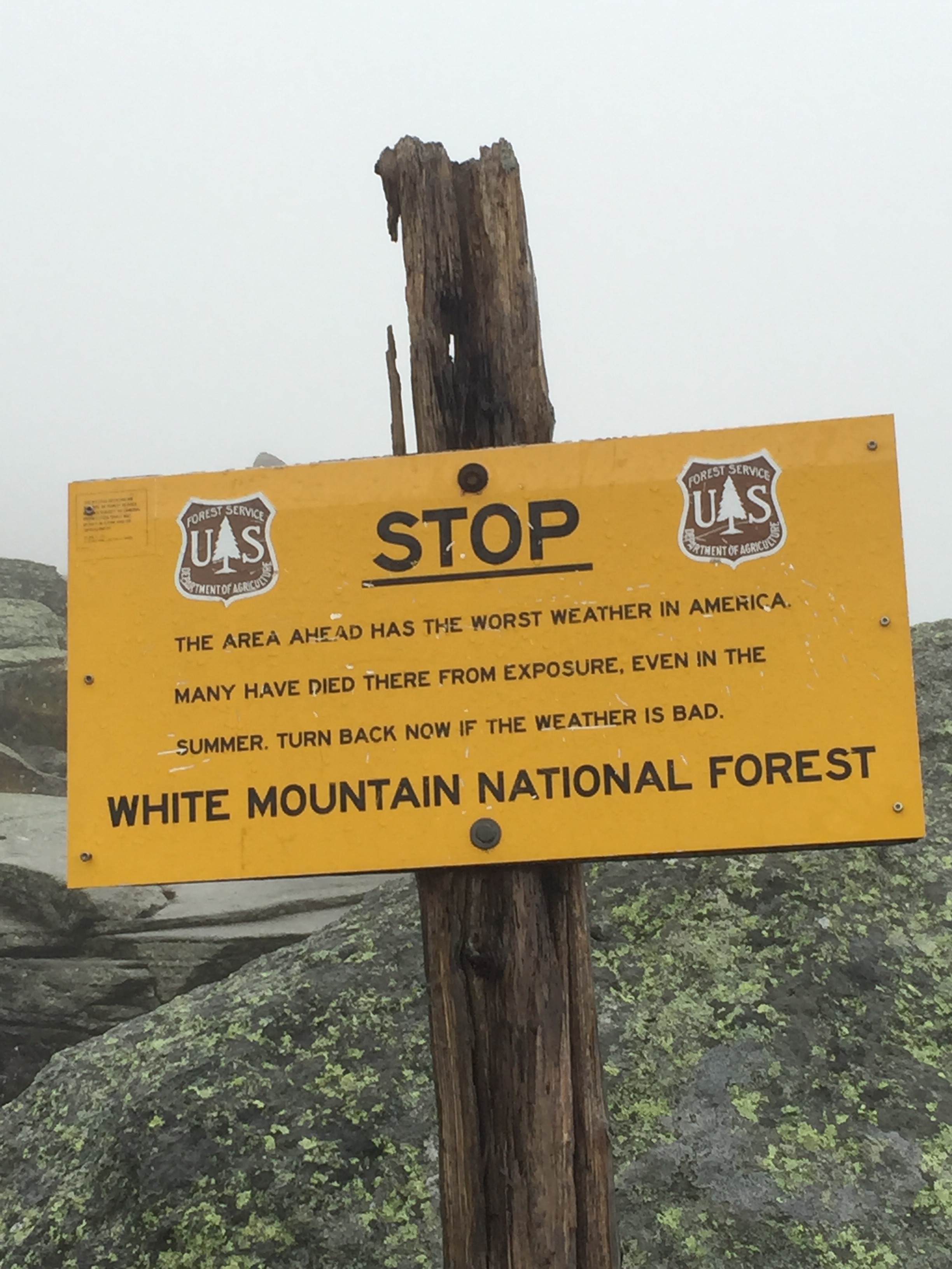 We had a bit of a dilemma today. It rained all night and everything we have is wet. Today we were planning to hike over Mt. Washington, which has the worst weather in America, and it is calling for rain and afternoon thunderstorms thru Monday. The only road anywhere around is at the top of Mt. Washington. There is a cog rail down from there and a shuttle van. They’re both very pricey. We decided, though, that we can’t sit in wet tents for 3 days, so we all agreed to head out early and summit Washington in the clouds and if it gets bad, we’ll take the cog or shuttle down and return when the weather clears. That’s what we did. We headed out, all wet and cold. It started raining again within 10 minutes of being on the trail. We had about 3-1/2 miles to get to the AMC run hut that had no availabilities or any work for stays. The dungeon was even full. They did, however, sell us some leftover bacon, potato soup for breakfast and it was so warm and delicious. We still couldn’t get warm though so we had to keep moving. We had 1.4 miles to go to summit. The weather was horrific. The temps were in the 30’s and the winds literally blew me down. They were blowing around 50 mph with gusts of 75 mph. The rain turned to sleet and pelted us all in the left side of the face. Thank goodness we were all peppy enough today to climb quickly. There were zero views. You would never know there were other mountains around. We were socked in. We literally walked right up to the summit without even being able to see the buildings until we were right in front of them. We all quickly agreed to shuttle down for the night to the Yellow Deli Hostel in Lancaster and watch the weather and then shuttle back up to hike down the northern side of Washington. So–here I am in Lancaster waiting to check the morning weather on Washington and then decide our next move. I’ve always thought Mt. Washington would be one of the hardest climbs, but I was wrong. It was a pretty easy ascent (comparatively speaking), even with the crazy weather.