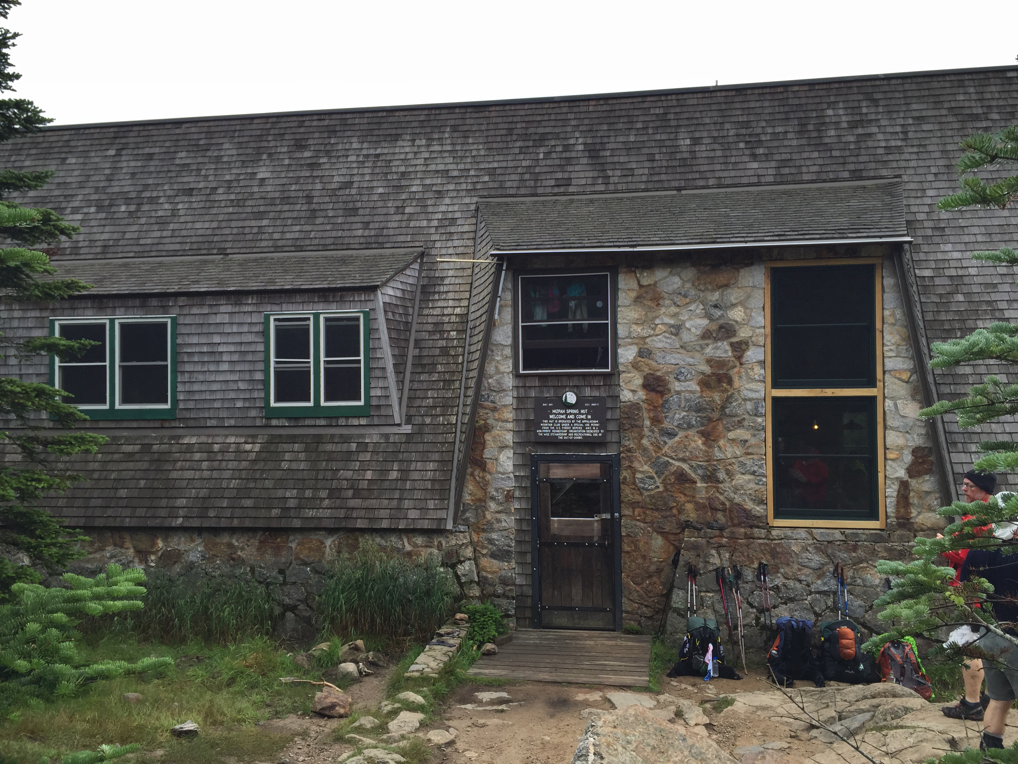 I can’t say enough good things about this hostel. The young owners, Serena and Justin, are wonderful hosts. They just opened July 15 and were full this weekend. The weekenders are gone, but there are still about 10 people here. I will be staying another night due to a hail and torrential rainstorm in the mountains. I and the other 2 NOBO’s that were going to hike together today all decided it wasn’t the day to be above tree line. Tomorrow is suppose to be nice–Thank Goodness. I am going stir crazy. The bad thing is that it’s just rain here, but the storm is up on the mountain, so it feels like I should be able to hike. Oh well. EVERYONE has told me over and over, “When you get to the Whites, if it calls for bad weather, don’t go.” So, since no one else is hiking out, I decided to stay. I’ve walked the 1-1/2 miles to town to stroll in the rain and have lunch and the 1-1/2 miles back. Now, I think I’ll take a nap.